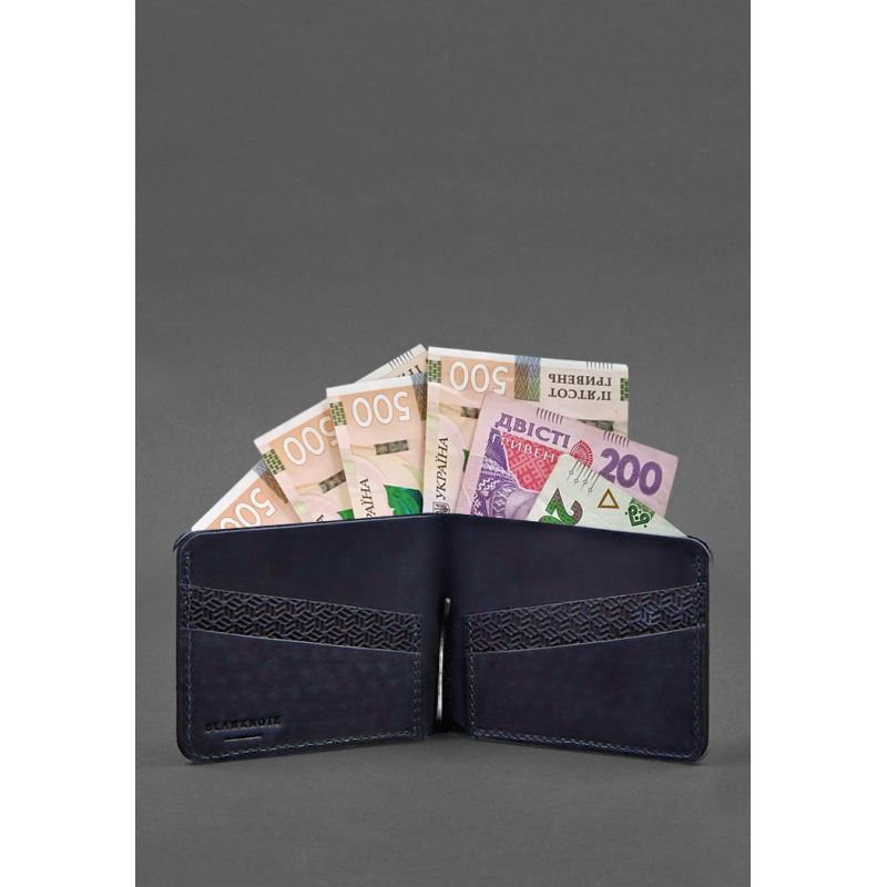 Кожаное портмоне 4.4 (с зажимом) синий Crazy Horse карбон — отличный выбор для тех, кто ищет стильное и практичное решение для хранения кредитных карт и наличных денег. Изготовленное из высококачественной кожи Crazy Horse с тиснением в виде сот. Оно обеспечивает долговечность и элегантный внешний вид.