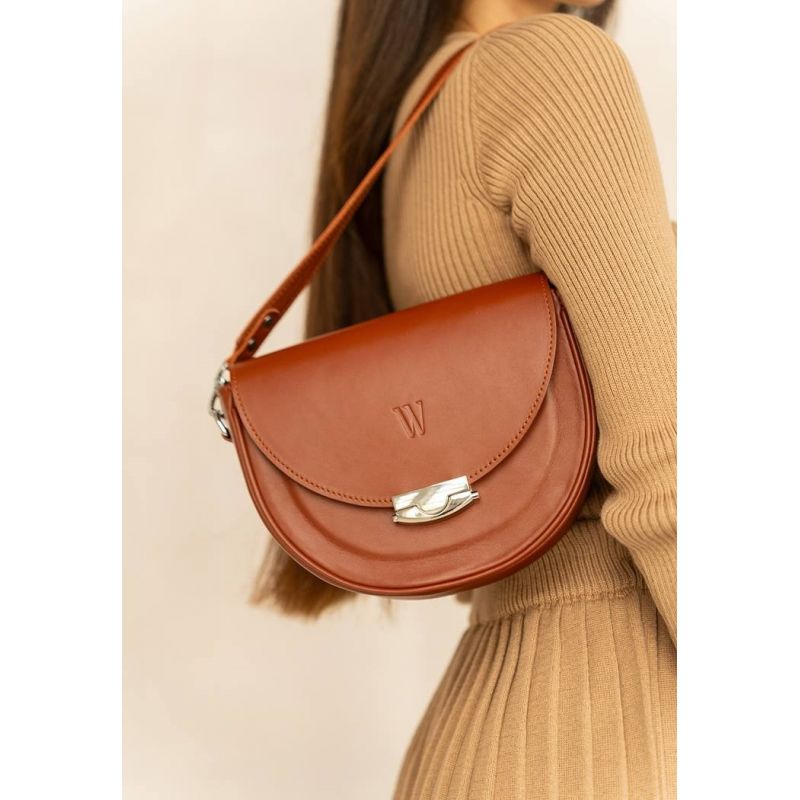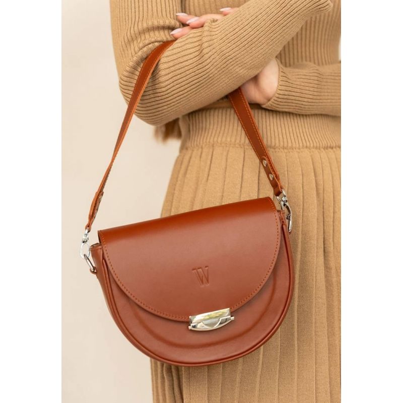 Внешний вид сумки очаровывает своей формой полукруга, создавая гармоничный и изящный образ. Она изготовлена из высококачественной натуральной кожи, что придает ей прочность и долговечность.