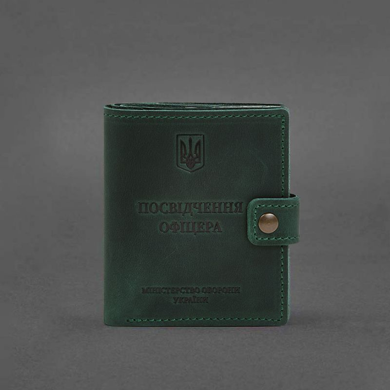 Кожаная обложка-портмоне на удостоверение офицера от бренда БланкНот специально разработана для бережного хранения вашего документа. Сшита из высококачественной натуральной кожи crazy horse с винтажной матовой поверхностью. Кожа crazy horse обладает винтажным эффектом, она достаточно крепкая и долговечная. Тиснение на лицевой стороне обложки полностью дублирует оригинальный бланк документа. Вверху расположен герб Украины, посередине находится надпись «Посвідчення офіцера» и в нижней части имеется тиснение «Міністерство оборони України» Внутри имеется 1 отделение для купюр, 3 слота для пластиковых карт, карман для жетона, прозрачный карман и отделение для документа. Закрывается портмоне-обложка хлястиком с кнопкой.   Почему стоит купить Кожаная обложка-портмоне для удостоверения офицера  с карманом для жетона 11.1 зеленая Crazy Horse (BN-OP-11-1-iz) от BlankNote? Качественная натуральная кожа Четкое и хорошее тиснение Ручная работы Гарантия 3 года Наши мастера могут изготовить обложку-портмоне в любом другом цвете. Также изделие можно персонализировать. Обратите внимание на наши изделия с украинской символикой. Рекомендуем обложки для паспорта с гербом Украины. Гарантия на обложку-портмоне - 3 года с момента покупки. ВНИМАНИЕ! Выделка данной кожи предполагает естественное появление на ней царапин и потертостей в ходе использования! От этого изделие становится более индивидуальным и приятным, это оценят настоящие поклонники винтажного стиля:)  А так же первое время кожа может краситься при сильном трении об другие предметы  - это особенность её выделки, постепенно этот эффект уменьшается,  кожа полируется и приобретает чуть глянцевый эффект. Фурнитура и комплектация может быть изменена производителем