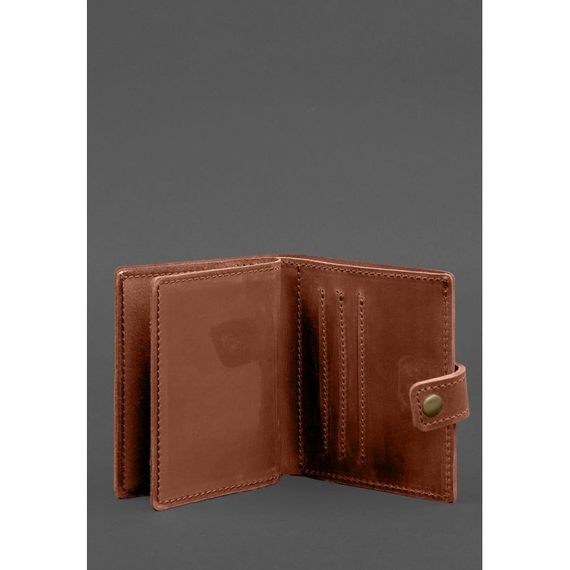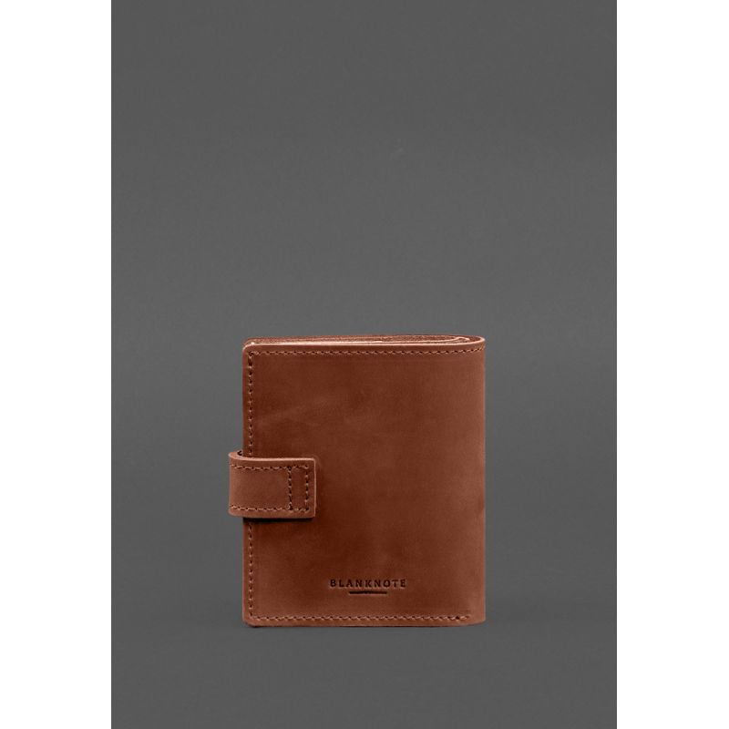 Внутри имеется 1 отделение для купюр, 3 слота для пластиковых карт, прозрачный карман и отделение для документа. Закрывается портмоне-обложка хлястиком с кнопкой.