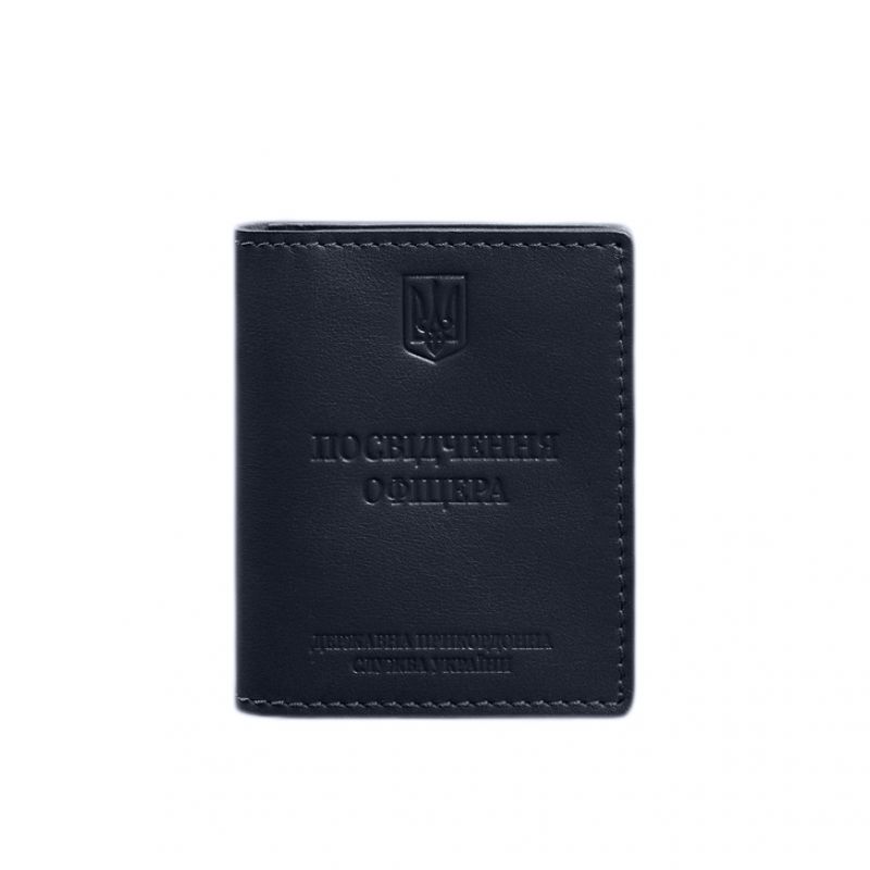 Тиснение на лицевой стороне обложки полностью дублирует оригинальный бланк документа. Вверху расположен герб Украины, посередине находится надпись «Посвідчення офіцера», ниже – «Державна Прикордонна Служба України»
