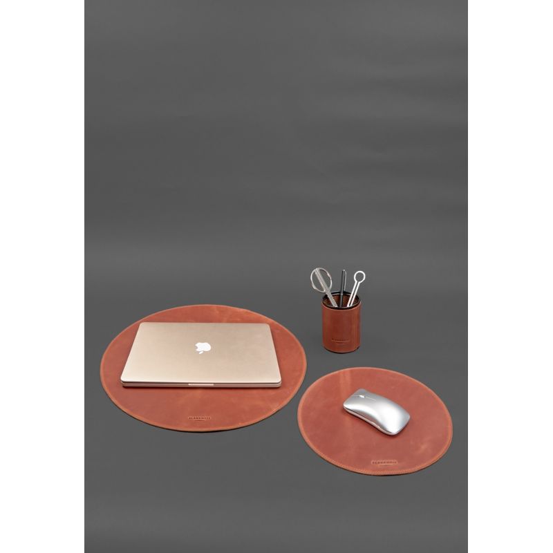 Коврик под ноутбук защитит поверхность любого стола от царапин и потертостей, которые могут появляться в процессе работы. Кожаный коврик для мышки увеличивает точность наведения курсора, улучшает скольжение и предотвращает появление царапин на нижней части корпуса устройства, а также на столе. Кожаный стакан, предназначенный для хранения карандашей, различных ручек и других канцелярских принадлежностей также будет очень кстати.