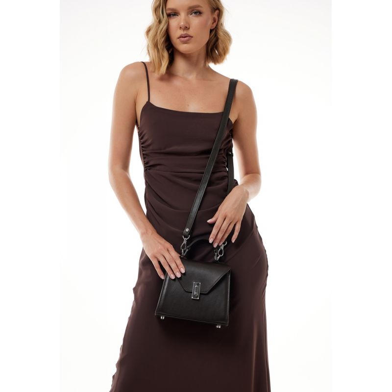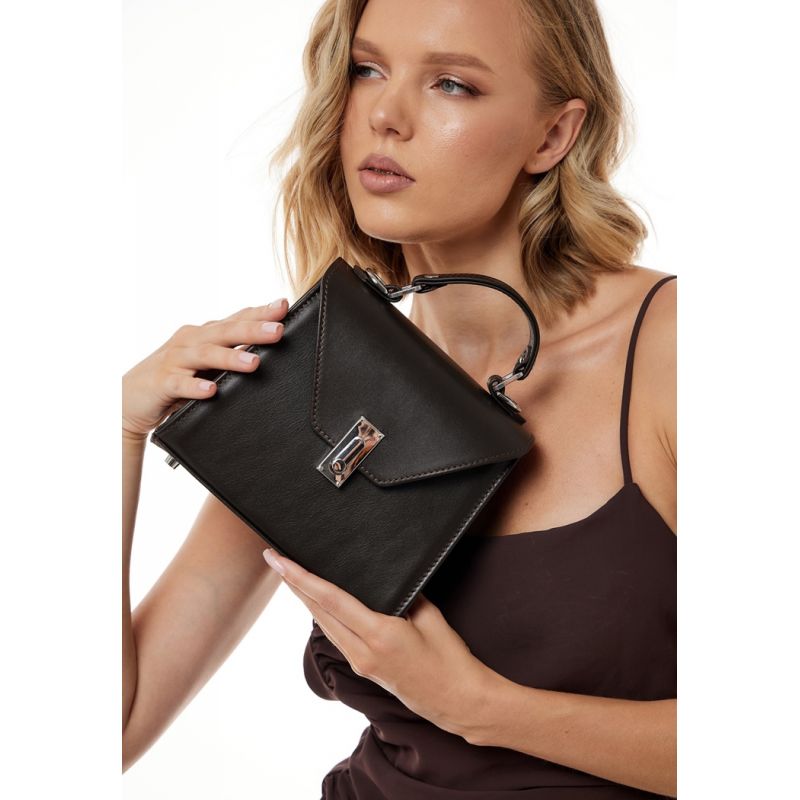 Сумка оснащена короткой ручкой и длинным ремешком.