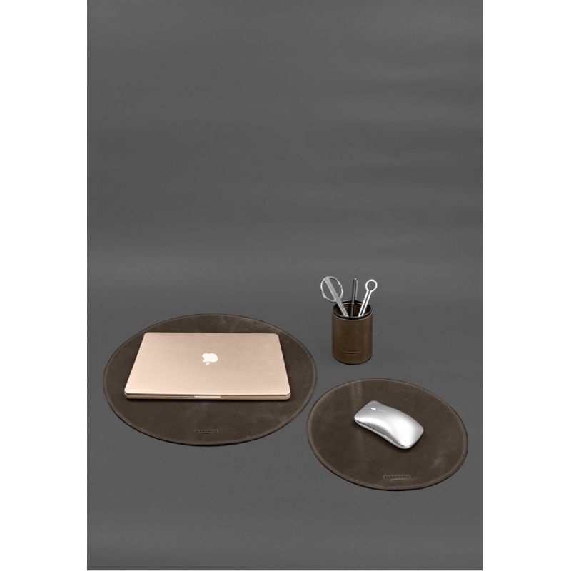 Коврик под ноутбук защитит поверхность любого стола от царапин и потертостей, которые могут появляться в процессе работы. Кожаный коврик для мышки увеличивает точность наведения курсора, улучшает скольжение и предотвращает появление царапин на нижней части корпуса устройства, а также на столе. Кожаный стакан, предназначенный для хранения карандашей, различных ручек и других канцелярских принадлежностей также будет очень кстати.