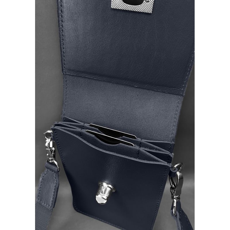 Сумка оснащена тремя отделениями, позволяющими удобно разместить телефон, документы и прочие мелочи внутри. Между отделениями в соединениях имеются карманы для карт. Закрытие сумки производится с помощью клапана, который фиксируется замком.