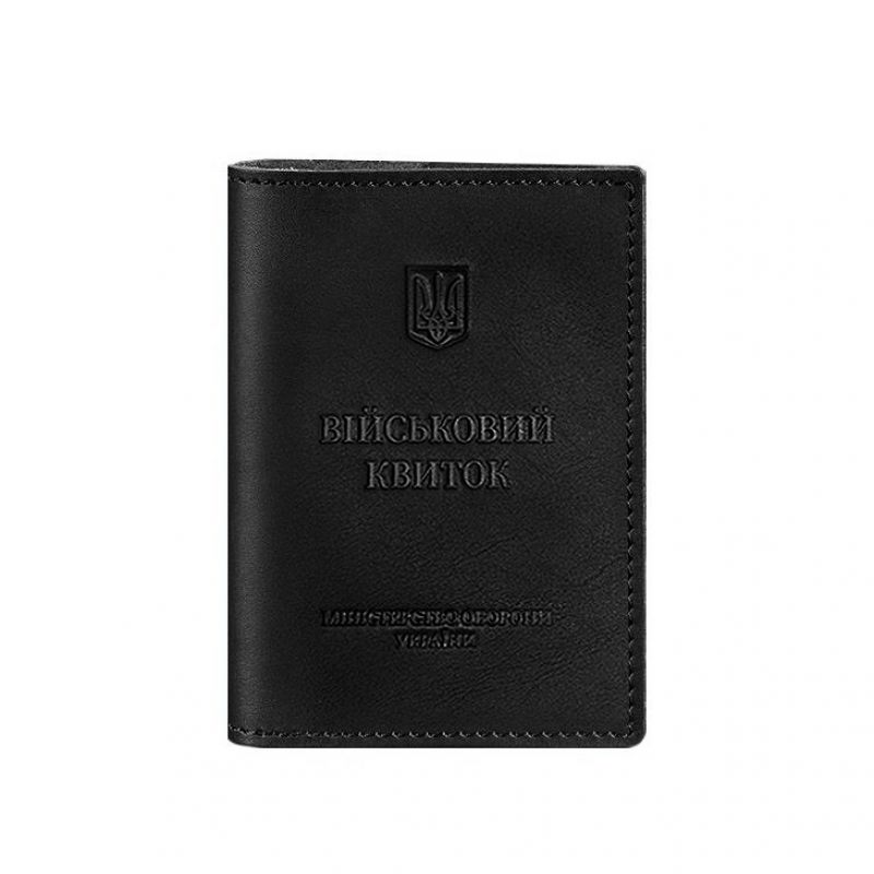 Тиснение на лицевой стороне обложки полностью дублирует оригинальный бланк документа. Вверху расположен герб Украины, посередине находится надпись «Військовий квиток» и в нижней части имеется тиснение "Міністерство оборони України"