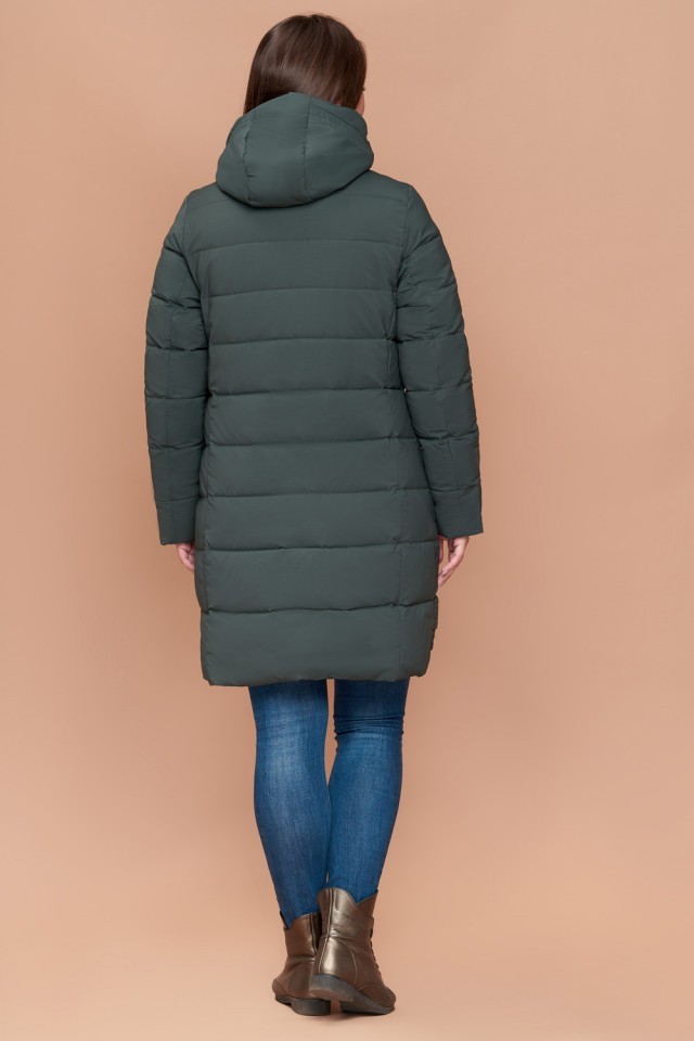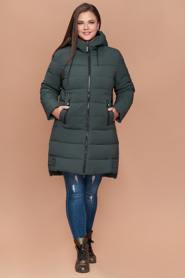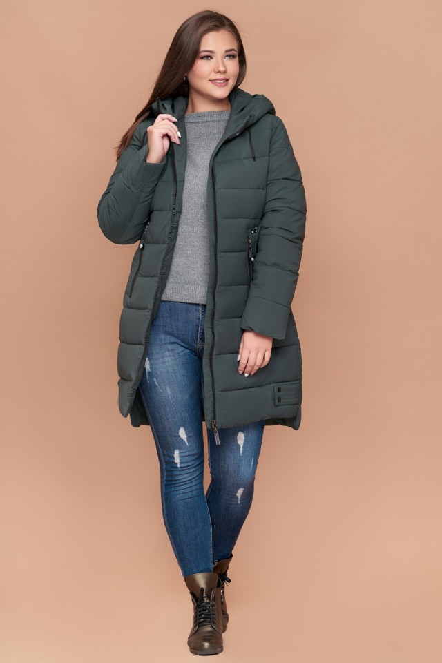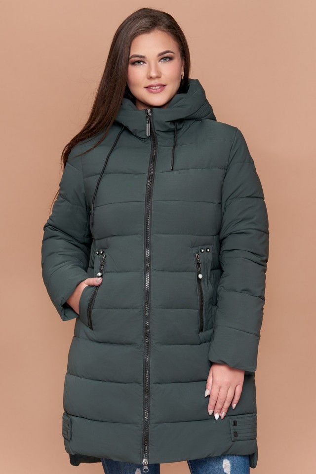 Пуховик серо-зеленого цвета большого размера зимний женский модель 25225