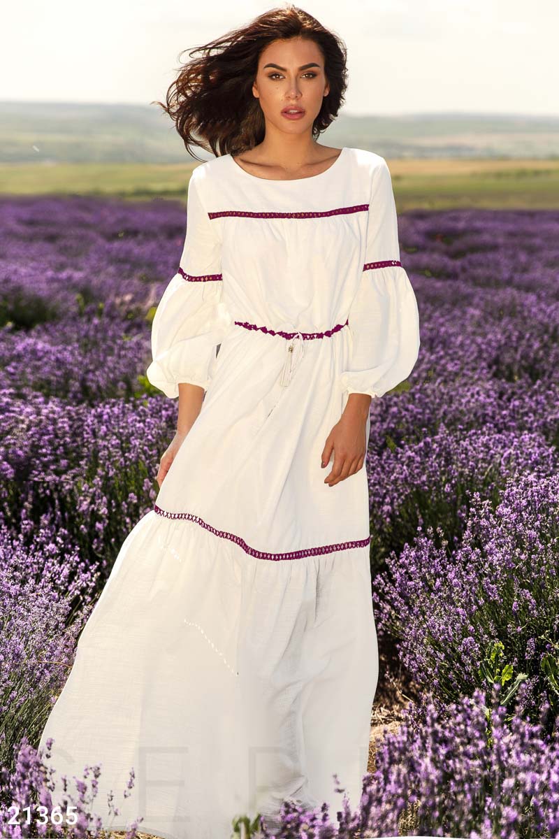 Романтичное платье-макси из воздушной хлопковой ткани с длинными рукавом-фонарик, контрастными вставками из вязаной тесьмы и завязками на поясе.