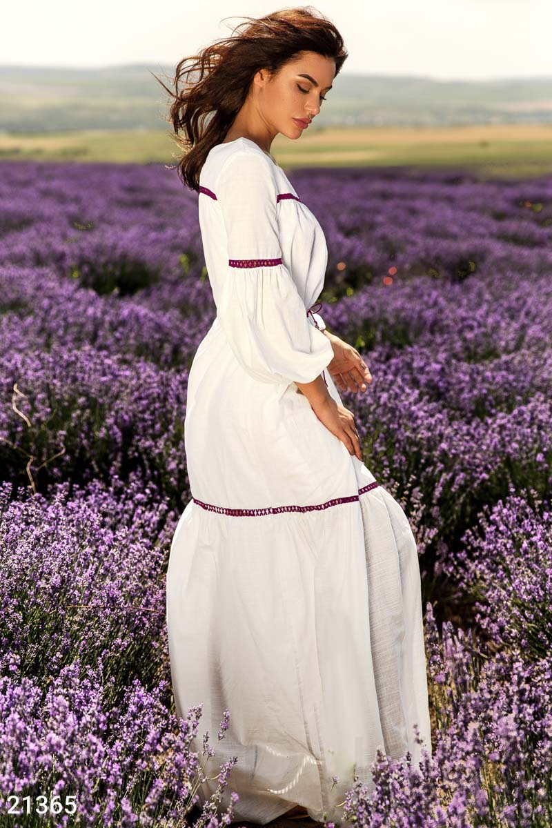 Романтичное платье-макси из воздушной хлопковой ткани с длинными рукавом-фонарик, контрастными вставками из вязаной тесьмы и завязками на поясе. Подробнее https://gepur.com/product/plate-21365
