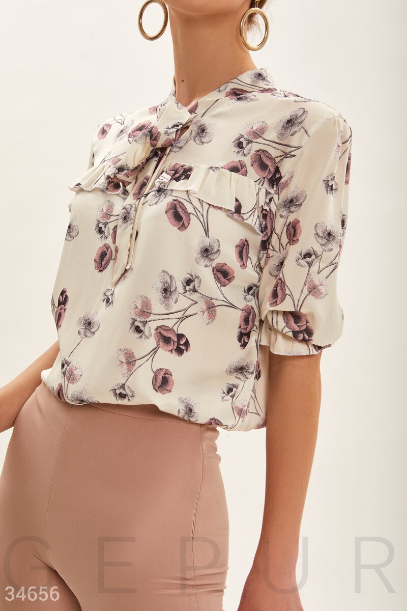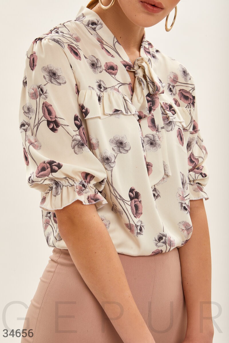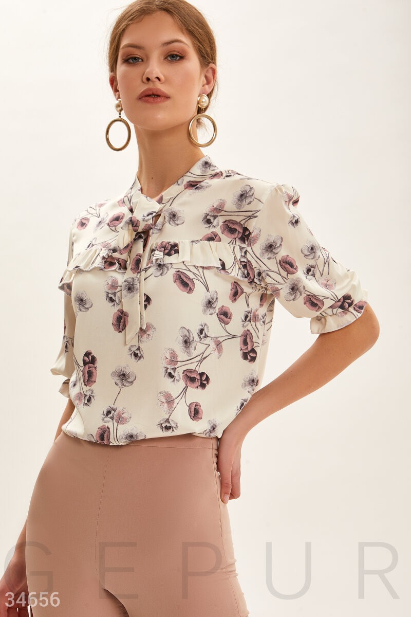Изысканная блуза из искусственного шелка с цветочным принтом. Свободный крой. Воротник с завязками или воротник-аскот, изящные рюши на груди. Короткий рукав на эластичной манжете.