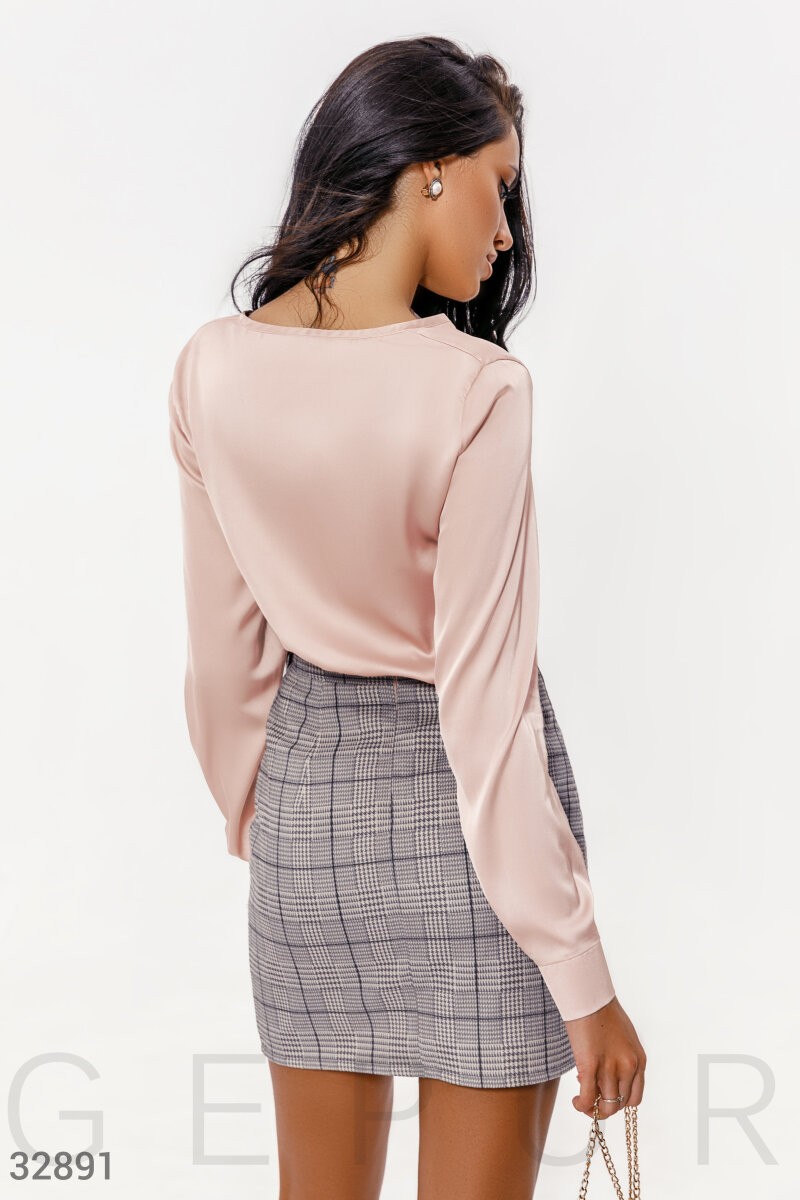 Строгая шелковая блуза бежевого цвета с круглым вырезом, длинным рукавом и скрытой планкой с пуговицами спереди.