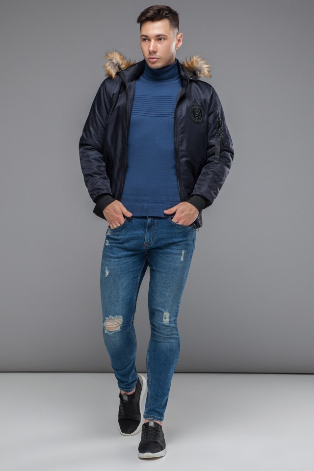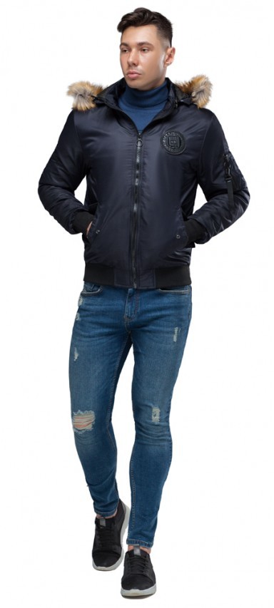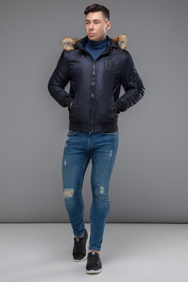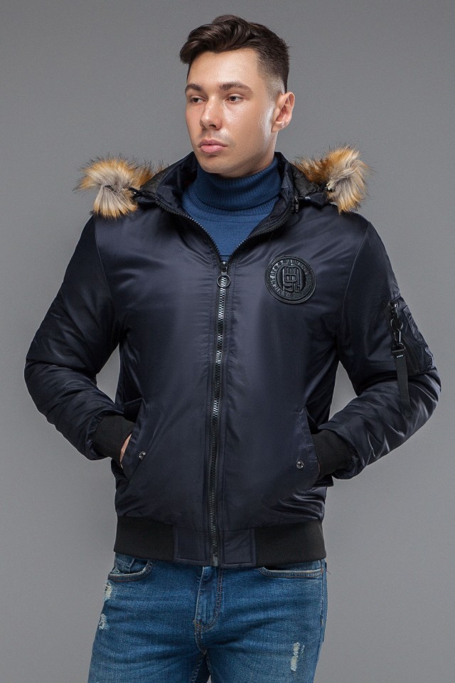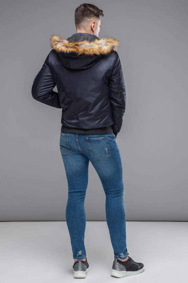 Темно-синий мужской молодежный бомбер осенне-весенний с опушкой модель 46575