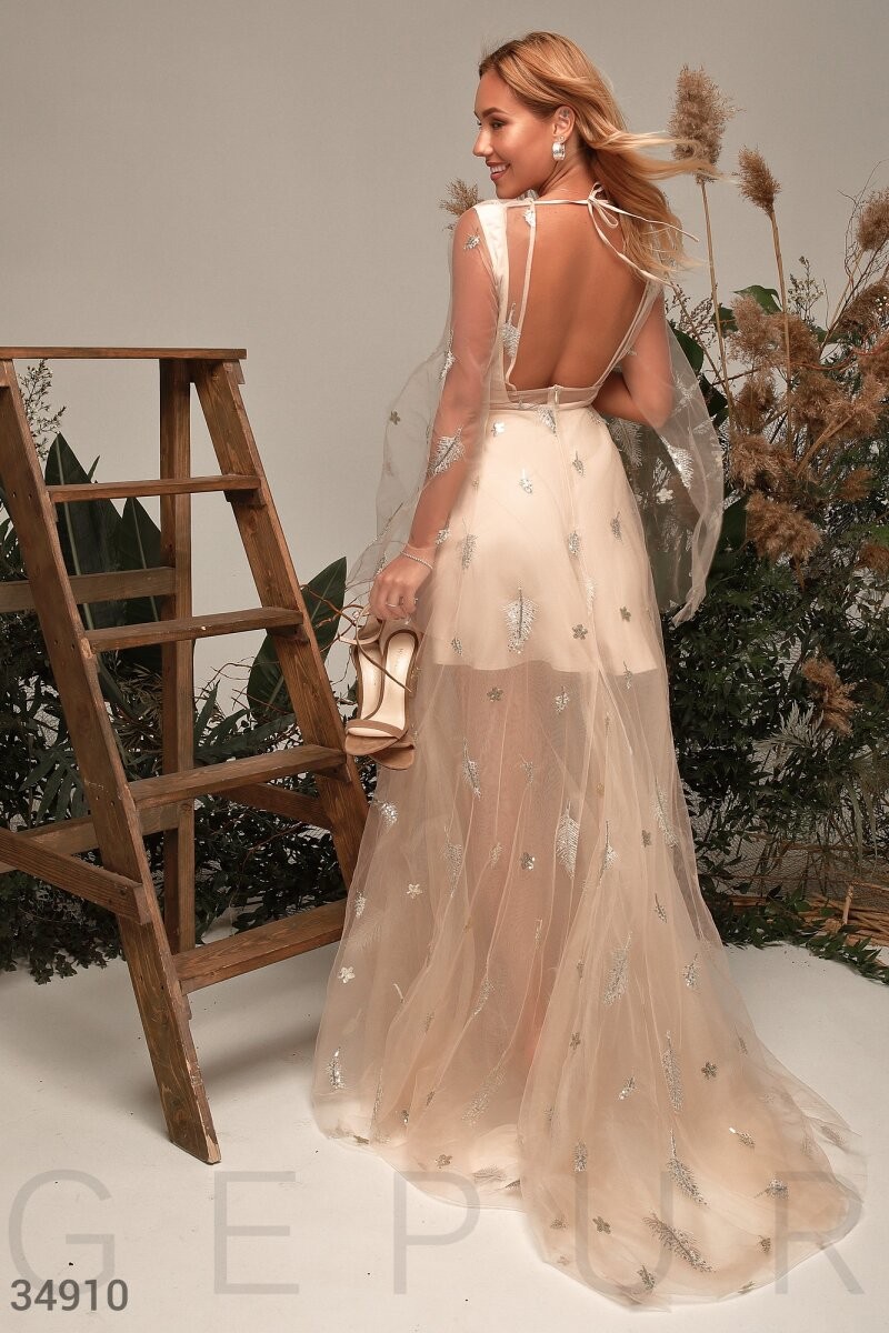 Утонченное длинное платье-сетка от дизайнеров Gepur: основа из короткого сарафана с v-образным вырезом и открытой спинкой, воздушное прозрачное платье-макси, украшенное блестящим декором и рукава-клеш с эффектным разрезом по всей длине
