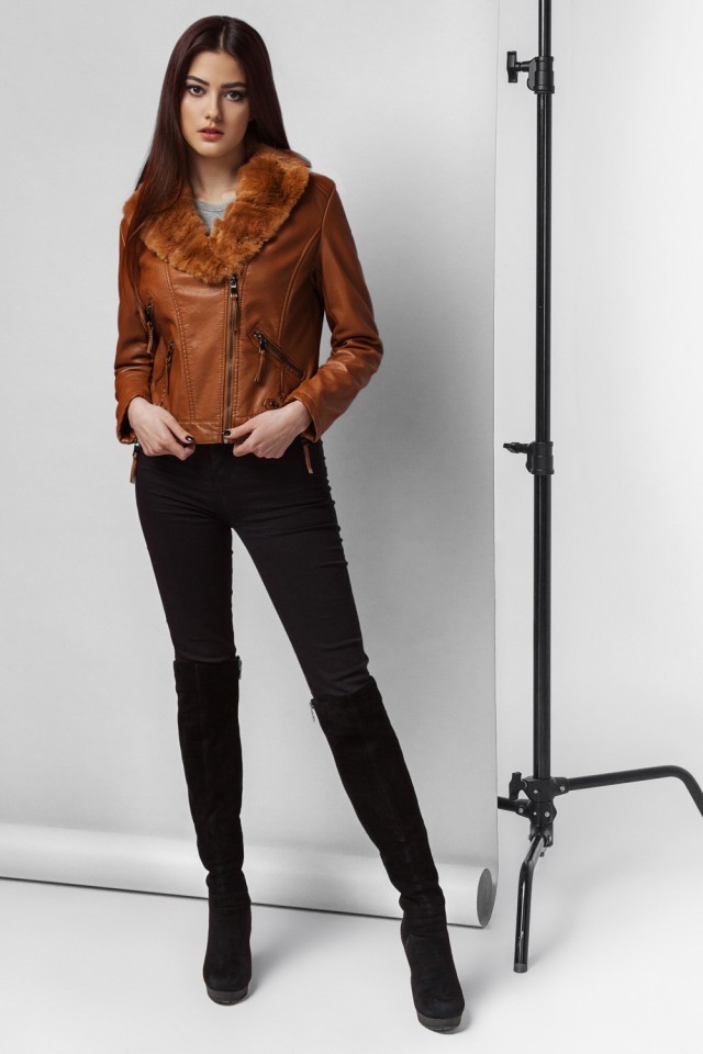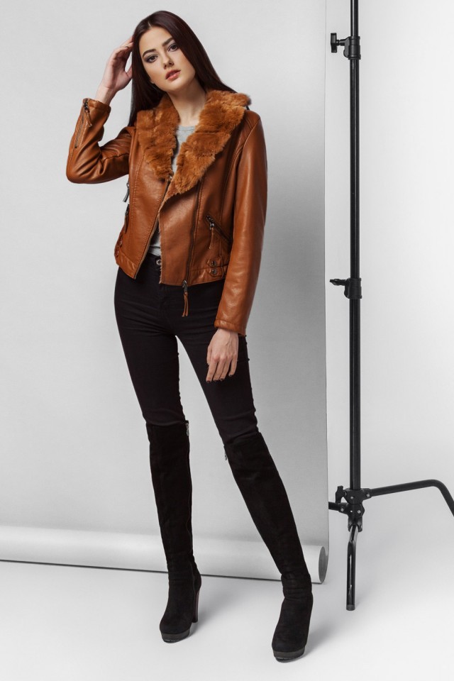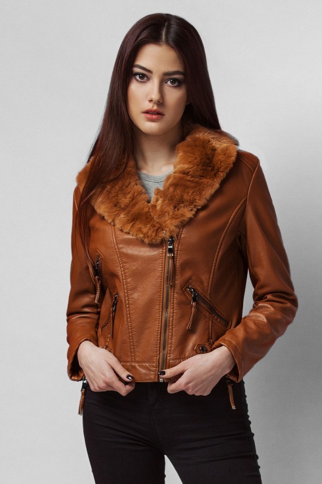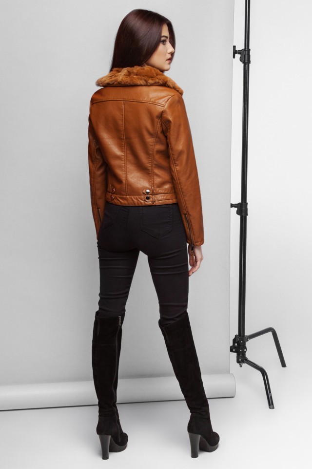 Женский осенне-весенний молодежный пуховик из экокожи цвет коричневый модель 25623